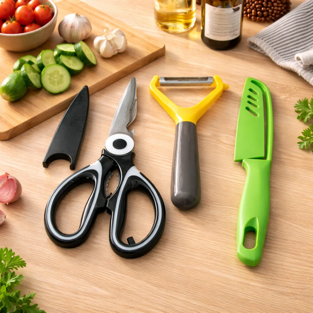 This dual-purpose kitchen set features a sharp vegetable peeler and heavy-duty scissors for efficient food preparation. The ergonomic handles provide a comfortable grip, while the stainless steel blades ensure precision cutting and peeling for a variety of fruits and vegetables.