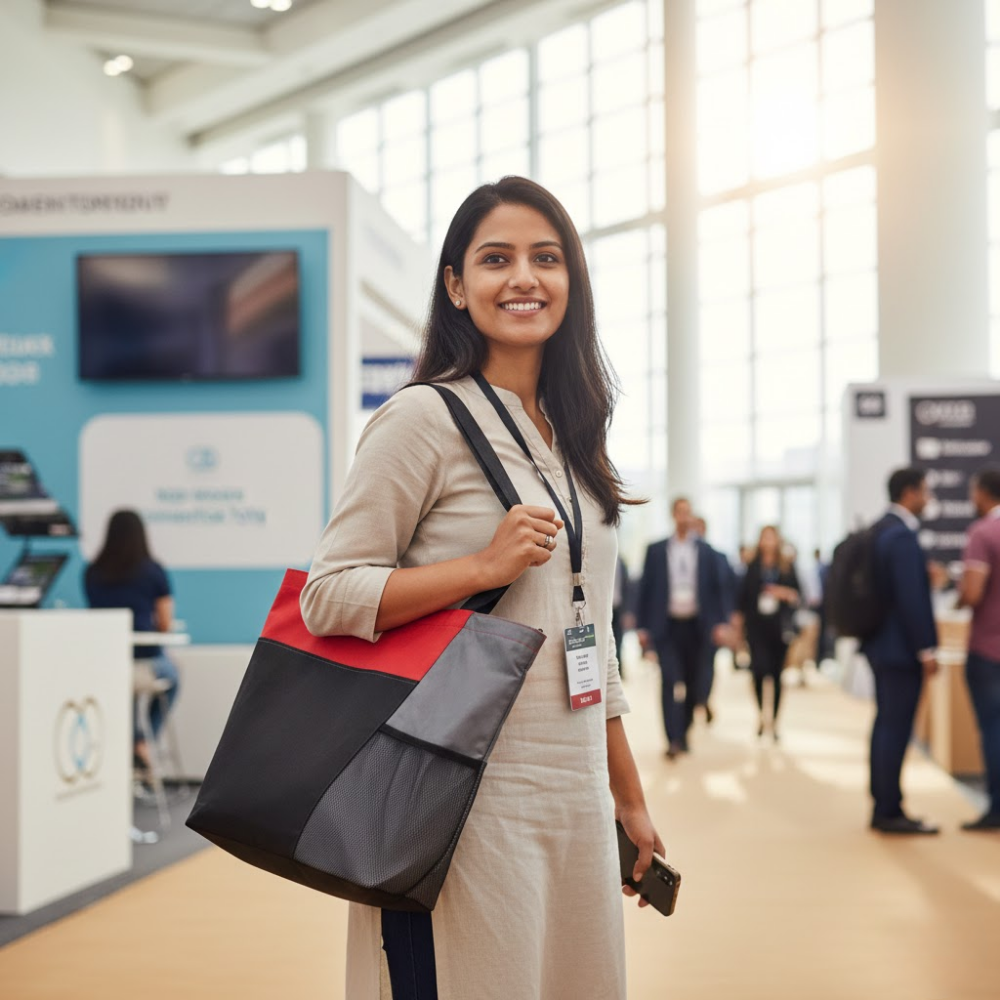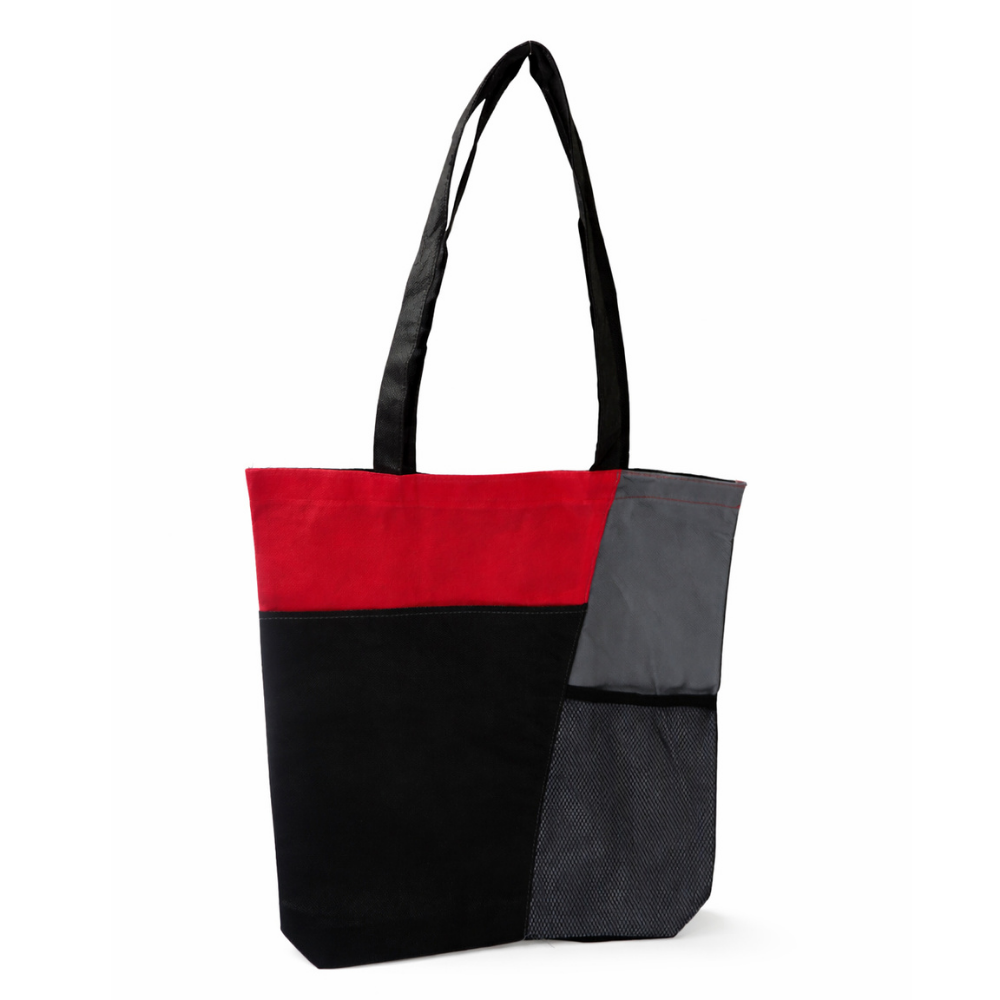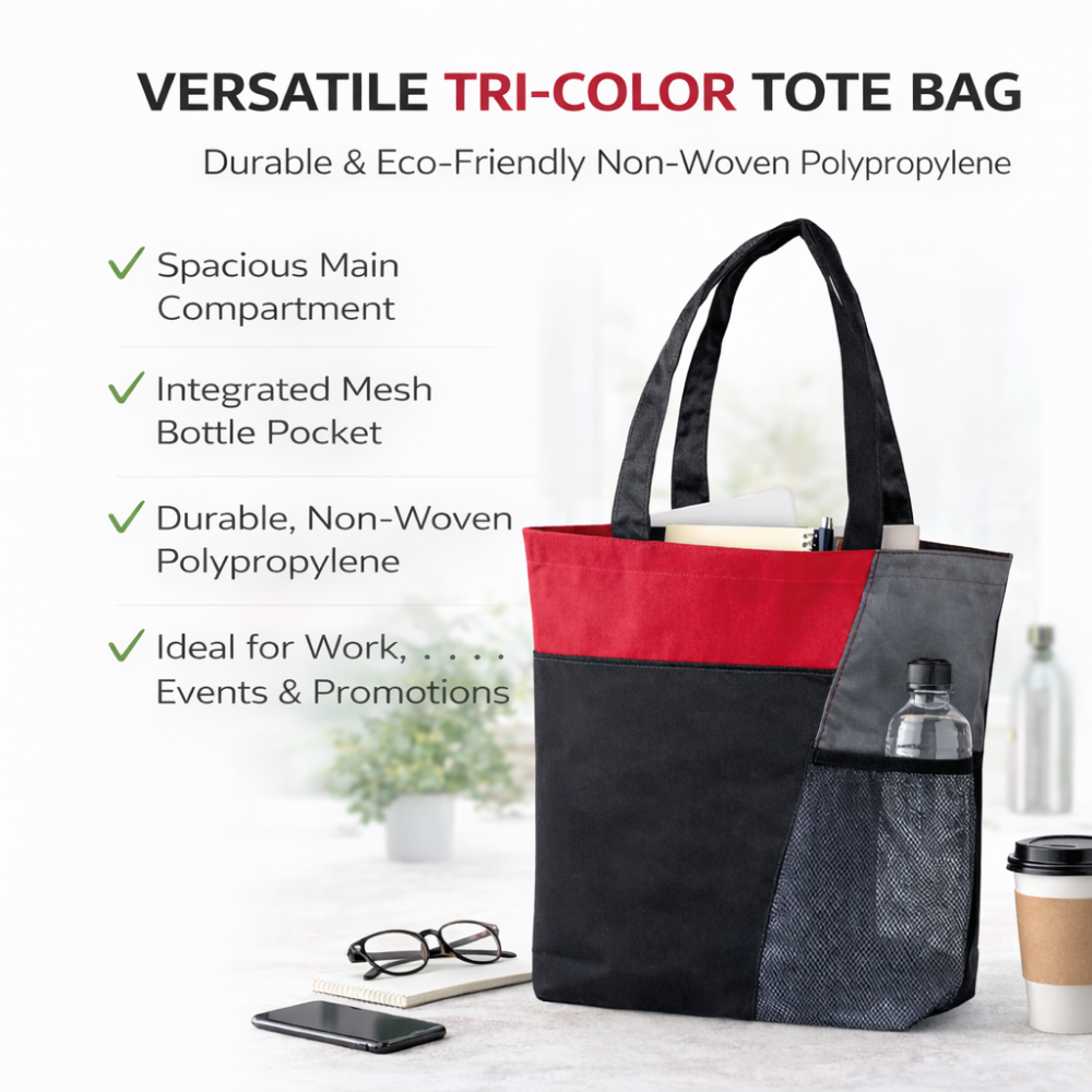 This eco-friendly polypropylene tote provides efficient organization for professional events through its spacious main compartment and integrated mesh bottle holder. The lightweight design and reinforced handles ensure user comfort while carrying documents, water bottles, and essential trade show materials.